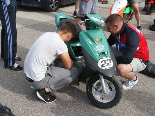 Egyre hosszabb a sor a gépátvételnél, robogót már kellett megbontani - a Szkaliczki Team Yamaha Jogja lett gyanús, de az idomokat leszedve kiderült, hogy minden rendben. A ruhák terén viszont kellett visszadobni - egy csizmát és két bukósisakot alkalmatlannak minősítettek a versenyre.