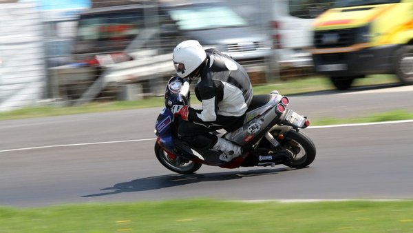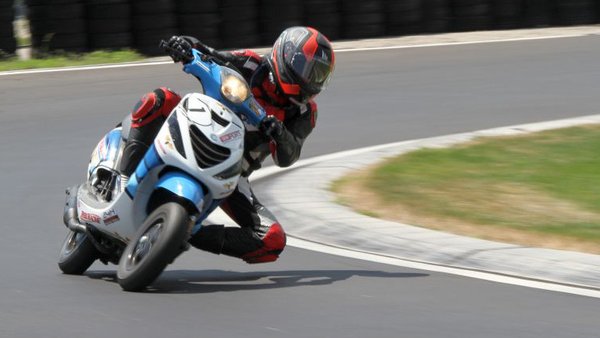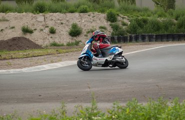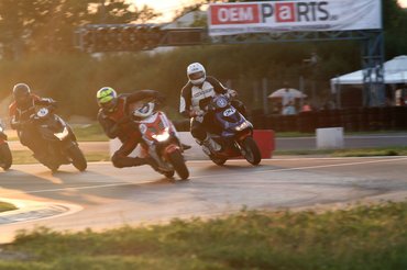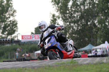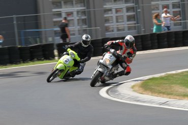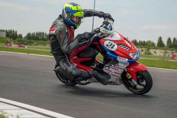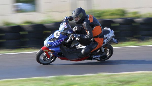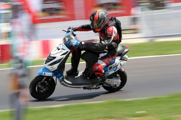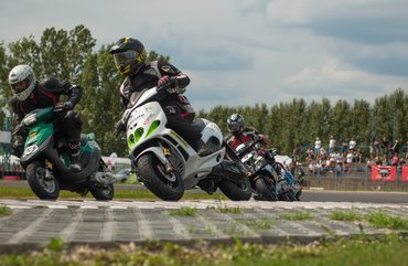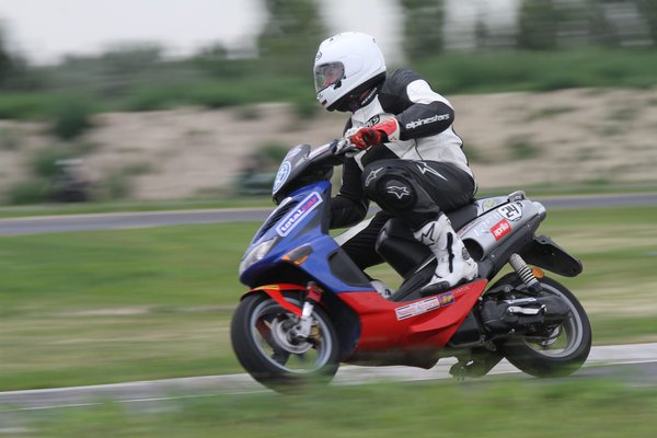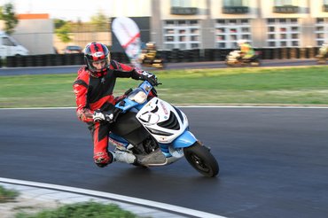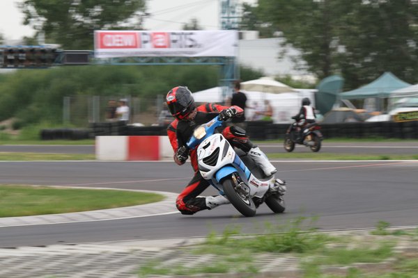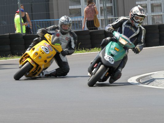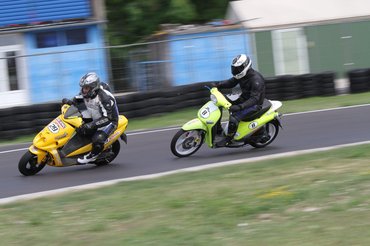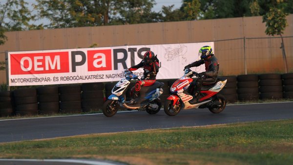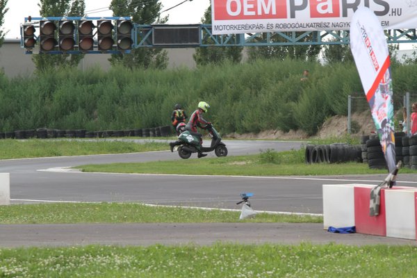 Ilyen egy mesteri előzés a mérleg-kanyarban. Előadja a Kimle Scooter Team, jelenleg vezetik a mezőnyt, két körrel a Motoralkatrész.eu előtt. A második, harmadik, negyedik és ötödik helyen állók egy körön belül vannak.