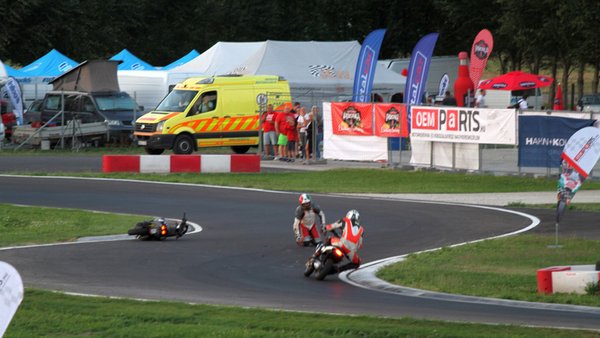 Az első tíz percben sorozatosak voltak az esések, egymás hóna alatt mentek el a versenyzők. A Totalbike csapatában Anti hatalmasat esett, a most szerelik a robogót. Anti egy másik versenyzővel akadt össze, és erősen összecsukta a motort, és magát is megütötte - igazából az fáj neki, ahogyan a mögötte érkező, aki vagy meglökte, vagy nem, de átment Anti kezén.
