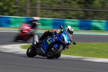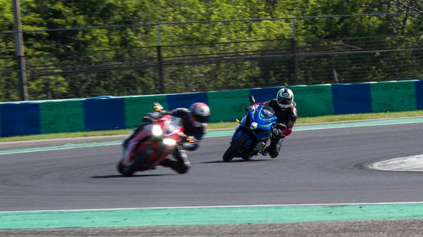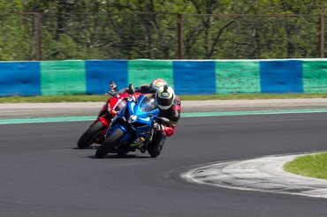 Míg a CBR üléspozíciója az alacsonyabbaknak van kedvére – ezt alkalmi segítőnk, a nálam jóval alacsonyabb ex-versenyző Király Laci is megerősítette. Szóval lehet a CBR bármilyen szép, a GSX-R-rel jobb volt menni utcán, mert nekem jobb ülni rajta és több visszajelzést ad, pályán pedig jobban tudtam mozogni. A Hungaroringen a CBR futóműve tűnik pontosabbnak és fordulékonyabbnak, tengelytávja például másfél centivel kisebb a Suzukinál, de a gumi miatt a CBR egyértelműen hátrányban volt. Ugyanis érthetetlen módon azzal a Dunlop D214-as gumival hoztam el 23 kilométerrel az órájában, amivel a Suzuki a túra-sport GSX-S1000-et szereli. Az alap GSX-R felnijein RS10-es Bridgestone feszül, mely tapadásban és visszajelzésben is fényévnyire van ettől a Dunloptól.