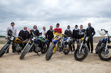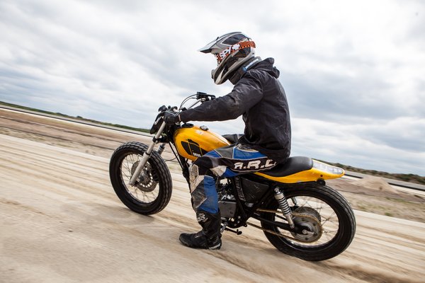 Az olasz suli első magyar tanulóbrigádja erősen vegyes összetételű, ex-pályaversenyzőtől a motorépítőn át az ügyvédig, ez a felszerelésünkön is látszott. Én a krosszos cuccaimat hoztam magammal, de krosszcsizma helyett gyorsasági csizmát javasolt a mester. A salakmotorokhoz képest alapvető különbség, hogy a motorok szériagépekből vannak átalakítva. Ezáltal van váltó és fék is. Az iskola SR400-as Yamahákat használ, amiket a milánói Deus műhelyben kusztomizáltak. Kinézni is stílusosan kell ugyebár, nemcsak keresztbe menni.