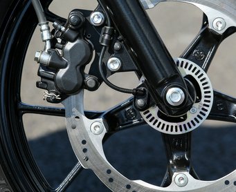 A teszt a Silverstone-i pálya melletti kispályán zajlott – leginkább a kecskemétihez hasonlít, de annál hosszabb, van benne csikicsuki, szűk visszafordító és néhány hosszú, nyélgázas kanyar – ha azokat sikerül lapon elfordulni, akkor a célegyenes végén még éppen át lehet rúgni ötösbe, és utána egyből, 120 körüli tempóról megkezdeni a fékezést. Az első tárcsa tisztességes méretű, de a nyereg látványosan olcsó, a fékerővel amúgy nincs gond, bele lehet állítani az első kereket az aszfaltba, viszont az érzéki visszajelzések hiányoznak belőle. A hátsó ugyanilyen – a legfrissebb fejlesztésű Bosch ABS viszont pontosan működik, nem pofázik idő előtt bele, hagyja, hogy a motoros szépen kitolja a határait.