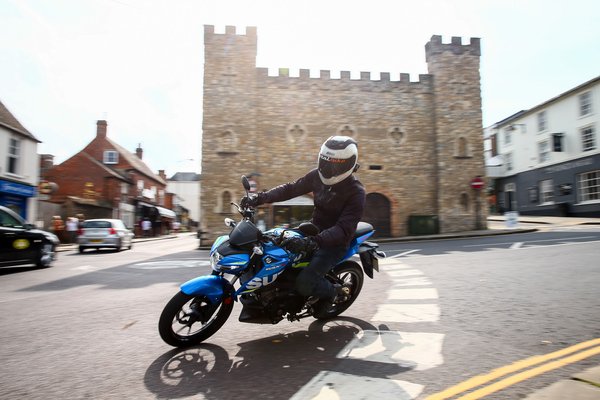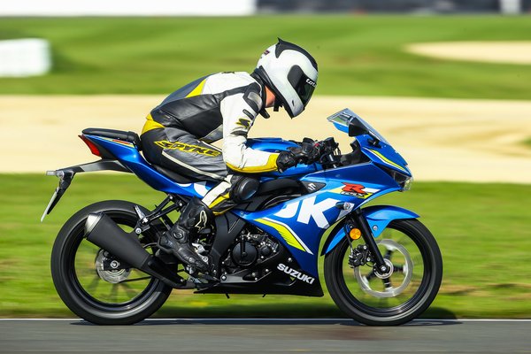 15 lóerőt tud tízezernél, szépen indul, de a menés a nyomatékcsúcstól, tehát nagyjából nyolcezres fordulatnál kezdődik. A tiltásba meglehetősen lassan szalad bele, a fordulatszám-tartomány utolsó szakasza meglepően sokáig tart. A váltón sokat kellett szteppelni, ha nem akartam azonnal lemaradni a felvezetőtől – amúgy idő kérdése volt csak, Taylor Mackenzie tavaly megnyerte a brit stock1000 bajnokságot, idén pedig a British Superbike-ban megy. A kuplung nélküli váltások sajnos nem adták, akadt, nem vette be a fokozatot, ez viszont egyedi hiba volt – a többiek motorján simán ment, és aztán a műszakilag teljesen azonos GSX-S125 sem finnyáskodott, ha szimplán gázelvétellel rúgtam felfelé.
