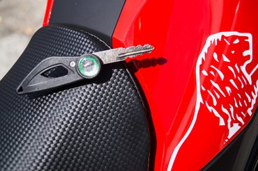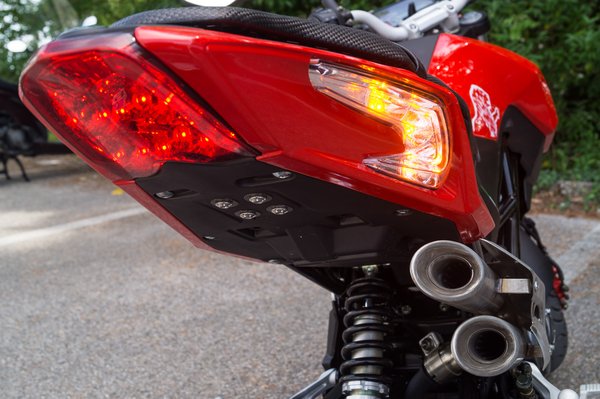 Hosszan nézegetve előkúsznak a megkapó részletek, a faridomba belesimított ledes irányjelzők, a multioptikás fényszóró és a bicskakulcs, de ott vannak még a nagy elődöket idéző lábtartók, a szerénytelenül pirosra fényezett féknyergek, valamint a tollszár stílusban vágott dupla kipufogó. Félhátsó nézet az MV Agusta Dragster 800-nak címzett pimasz beszólás.