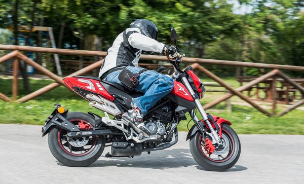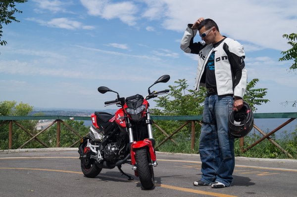 Rendszertanilag a kis gnómok közé tartozik – ezt az osztályt a mi éghajlatunkon a Honda MSX125-tel azonosítják, ugyanis az az egyetlen, ami Dél-Kelet-Ázsián kívül is értelmezhető karriert tudott befutni. Nem gyerekmotor, egyszerűen csak másfélszer kisebb egy hagyományos 125-ösönél, a kezelőszervei viszont felnőtt emberre szabottak. A formája is fél úton van a vagány és a paródia között, kell hozzá a humorérzék. A 12 collos, robogó méretű felniket majdnem kitöltik a féktárcsák, látványos 41 milliméteres fordított telószárakat tettek elé, amelyek egy hatszázasról származhatnának, a térhálós acél csőváz közepén pedig ott ül egy léghűtéses, egyhengeres blokk, egyetlen vezérműtengellyel és dupla gyújtással. Papíron 11 lóerő, ez önmagában sötét jóslat a menetdinamikáról: stiften vagy sehogy.