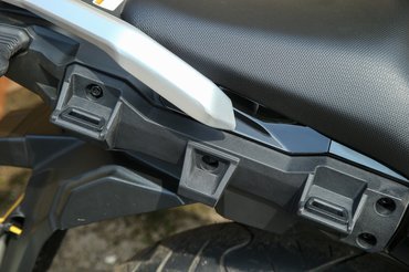 A doboztartókat megsüvegelem, mintha a motorgyártók kezdenék végre elfeledni az ocsmány konzolokat. A segédvázon kialakított felfogatási pontokhoz lehet rögzíteni az oldaldobozt, ami így szépen rásimul a motorra, még a kipufogót is úgy vezették el, hogy kofferek elférjenek. Jó jel, hogy a kiegészítőket együtt fejlesztették a motorral, nem utólag szedték össze külsős cégektől – a KTM és a BMW is így csinálja. A kartervédő pedig fémből készült, ami dícséretes ebben az egyáltalán nem prémium műfajban.