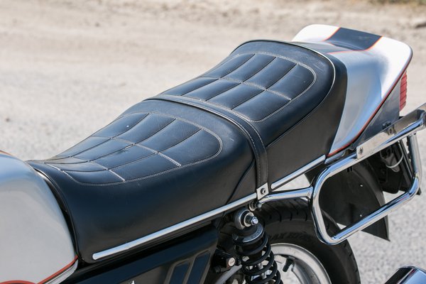 Mai szemmel nézve furák ezek az arányok, nagyon hetvenes-nyolcvanas évek fordulóját ordítanak. Elöl magasan a lámpa, hátul magasan a faridom, kipufogók szélesen a test mellett, de közben vázat alig látni bárhol, az egész eleje levegősen, fogvájókon lebeg, a nyereg egy vízszintes lóca. Oldalról nézve még mindig nagy tárgy, de háromnegyedből szinte filigrán, légies, még a széles blokk ellenére is.
