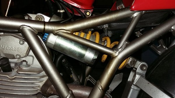Közben felfedeztem a Ducati utolsó, kigyomlálatlan hibájának a forrását is. Az én motoromon ugyanis a hátsó rugóstag gáztartálya beleért valamiért a vázba. Ezt már vásárláskor is láttam, de gondoltam, egy nem rá való alkatrész nem a világ, ettől még megveszem a gépet, aztán majd kitalálom, honnan szerezzek eredetit. A meglepő, hogy nem tudtam kinyomozni, milyen elem való rá, azazhogy minden kutatásom arra mutatott, hogy a megfelelő (pontosabban a 900SS-re való, de az ugyanaz, csak a csillapítása is állítható, nemcsak a feszessége) rugóstag van fent. Aztán sok-sok fotó nézegetése után rájöttem: az olasz fordítva szerelte be az alkatrészt... Spanival felemeltem a motort a garázsajtó szerkezetéhez, két csavart kellett kitekernem, megfordítottam a rugót, most az alja van alul és a teteje felül, tehát minden jó. Hihetetlen, de helyére került a gáztartály is, semmibe nem tud beleérni, sehogy. Tudom is, hogy az előző csávó miért fordította meg: nyilván egyedül motorozott, úgy nem súrlódott, viszont fejjel lefelé könnyebb hozzáférni a teleszkóp állítóberendezéseihez. Most nem könnyű, ez van. De legalább jó.