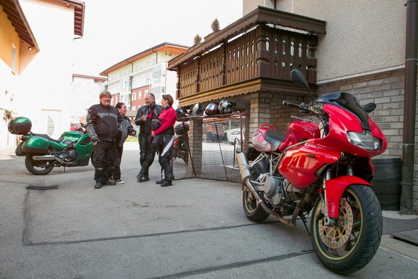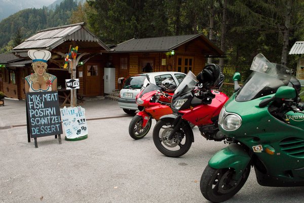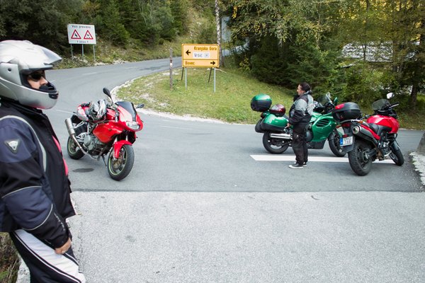 Másnap szép kanyar várt ránk. Amikor kábé egy hónappal korábban megrajzoltam az útvonalat a gúglmepszen, úgy gondoltam, hogy nyugodtan magunkhoz igazíthatom az útvonalat, mert mi leszünk a legfáradékonyabb láncszem a motoros kompániában, amelyben egy nagy dobozos Suzuki V-Strom 650, illetve egy hatalmas rakterekkel ellátott Triumph Trophy 1200 ígérkezik a másik két járműnek. Kellemes, 250 kilométeres kört vázoltam fel a Triglav környékén, Kranjska Gora felé, ott át a Vrsicen, majd le a Soca-folyó mentén délnek, s egy nagy kanyarral, Kobarid érintésével vissza Domzaléba. Négy és fél-öt óra lesz a túra, írta a Google, de tudom, hogy az autó nem motor, ráadásul a barátaim jellemzően úgy szoktak motorozni, hogy pálya, kis dombok, finom kanyargás, itt egy cigi, ott egy kis magos rúd, na, akkor egy kávé – szóval lassú menet, sok megállás az üzemmód.