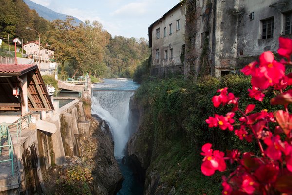 Említett függőleges sziklafal ugyanis még hosszan folytatódott lefelé, a túloldalon pedig ott volt a párja, ez csak azért nem látszott az útról, mert a kis platóra, ahol álltunk is, még egy házat is felhúztak. A szurdok alján pedig zubogott a víz, párája a mélyből felgomolygott majdnem odáig, ahol álltunk. A szlovén nem mulasztott el kétoldalra virágosládákat is felszerelni, bennük piros virágokkal. Épp sütött a lemenő Nap, a giccshatás nem maradt el, ha Csontváry lettem volna, ecsetet ragadok és ott, azonnal lefestem. Mivel nem, ezért csak kattintottam a telefonommal és meregettem a szememet, meglehetősen csontváryatlanul. A karizmám hiányára vall, hogy hiába értek közben utol bennünket a többiek, nem tudtam őket a korláthoz csábítani, csak Endréék gurultak kicsit hátrébb, belepillantani a helyszínbe, messziről – nem tudják, miről maradtak le.