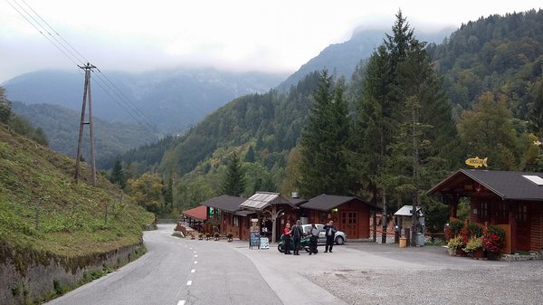 Kranjska Gora felé már gyönyörű tájon, zöldellő völgyekben kanyarogtunk, a Nap is kisütött, majd a városba beérve cigi-kávé-cukrászda-szünetet tartottunk. Jó kis hely, alpesi a hangulata, s találtunk egy piskótának álcázott cukrot igazán nagy mennyiségben és jól mérő helyet, emelkedett volt hát a hangulat. Onnan kezdődött igazán a túra.