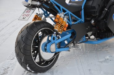 A V8 egy mechanikus kuplungon keresztül három inch-es szíjjal hatja a hátsó kereket - váltót meg építsen az, akinek nincs elég teljesítménye a direkt hajtáshoz. A rettenetes kerékpárhoz egyedi vázat gyártottak, és mivel nem találtak ehhez a tömeghez megfelelő erősségű motorkerékpár futóművet, egyszerűen duplán vettek mindenből, így elöl összesen négy darab Hayabusa telószár, hátul pedig ugyanannyi Öhlins rugóstag próbálja alátámasztani a ProBoost M1-et.