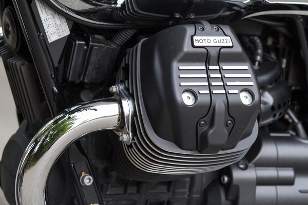 Alumíniumból készültek a hengerek, a dugattyúk, a hengerfej, sőt, még a forgattyúsház is, új olajpumpát terveztek hozzá, átalakították a blokk belső szellőzését – mindezt a viszonylag állandó termikus viszonyokért. Persze, egyszerűbb átállni a vízhűtésre, a Triumph is meglépte, a BMW és a Harley-Davidson pedig egyfajta hibrid megoldást választott, aminél a hengereket a menetszél hűti, de az igazán kritikus rész, a hengerfej vízköpenyt kapott. A Guzzinál nem fért bele stílusidegen vízhűtő, ezért még a kipufogókönyök is duplafalú, hogy azzal is biztosítsák az állandó hőmérsékletet. Nem csak tisztább és takarékosabb lett, hanem erősebb is, 48 lóerőről 52-re (@6200) húzták fel, a nyomatéka viszont nem változott, továbbra is 60 Nm. Ez a négy lóerő szinte semmi, de az új V7 lényegesen erősebbnek érződik.