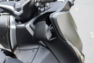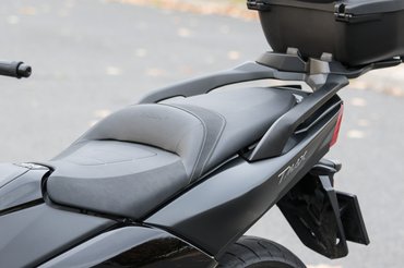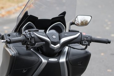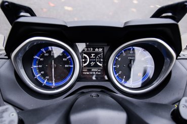Az új TMAX mostanra három modell: az alap mellett létezik egy SX- és egy DX-változat, ezek pedig lényegében felszereltségi szintek – ez a DX jelenleg a full-full, maga a luxus, amivel a Yamaha megpróbálja befogni a BMW C 650 GT-t.