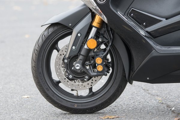 A fékek is állatul fognak, elöl két darab 267 mm-es tárcsa és négydugattyús, radiálisan rögzített nyergek fogják a tömeget, de a hátsó fék is tisztességes a 282-es tárcsával. Ahol a Piaggio MP3 LT-n imádkoztam, hogy legyen szíves annyira lelassulni, hogy le tudjam fordulni a körforgalmat, ott a TMAX-szal nem volt se aggodalom, sem fohász, egyszerűen lassult és elfordult, bárki bármit mondhat, szerintem ez a biztonságos közlekedés alapja. A kikapcsolhatatlan ABS ugyan érzésre túl korán szabályoz, de attól ez még egy jó fék.