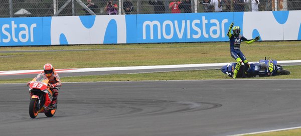 Márquez már a rajt előtt hibát követett el, amikor tolva indította újra motorját, majd a menetiránnyal szemben hajtva visszaállt rajthelyére. Ezért boxutca-áthajtásra kötelezték, miközben mindenki láthatta, abszolút győzelmi esélyekkel motorozik. Vezető helyről hívták ki. Talán ez volt az utolsó csepp a regnáló világbajnok poharában, ezt követően agresszív kismalacként közlekedett, és szó szerint felöklelte maga előtt a versenyzőket, szám szerint kettőt. Elsőként Aleix Espargaróba rongyolt, neki szerencséje volt, majd néhány körrel a vége előtt, a nyugodt, kiegyensúlyozott hatodik helyen motorozó Rossi következett.