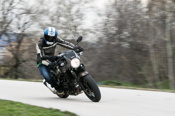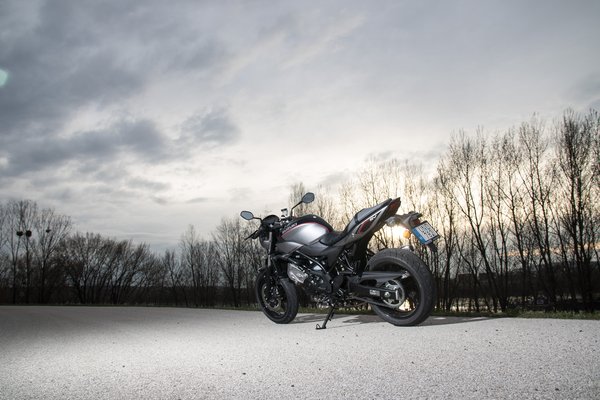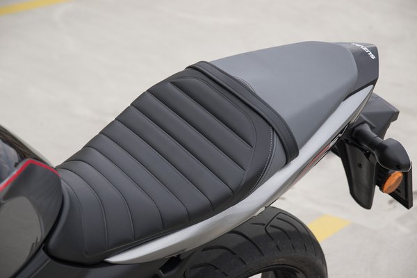 Az ülés szép, a jellegzetes café raceres üléspúpot optikai trükkel kerülték meg – erre ugyanis macerás lenne feltenni egy valódit, hiszen már nem lépcsős a fara, mint az ős-SV-nek, ezért az utas helyét szürke szövettel vonták be. A hurkásra varrt rész meglepően kemény, mint a bentlakásos katonai iskola, de legalább jól formázott, így hosszabb távon sem vészes.