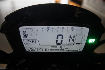 Műszerfal sokszorosan reciklált darab, ugyanez van a hétötvenes és ezres GSX-S-en is, viszont minden fontos dolgot tud, a fordulatszámtól kezdve az átlagfogyasztáson és az üzemanyagszinten át a fokozatkijelzőig. A visszapillantó szintén a funkció győzelme az esztétika felett, a célnak tökéletesen megfelel, látni a mögöttes forgalmat, de egy rövidebb tükörszárral nem akadnánk fel a sorok között, míg az egyszerre jó és szép megoldás a kormányvégtükör lenne.