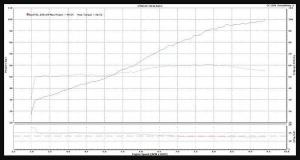 A britek mérése szerint 99,65 lóerőt adott le 9400-nál és 82 Nm volt a csúcsnyomaték, vagyis némileg elmaradt a gyári adattól. Hogy ebből az eltérésből mi írható a körülmények számlájára (hőmérséklet, stb...), és mi a gyártási szórás, lehetetlen megmondani, nem is különösebben érdekes. Annál inkább beszédes a teljesítmény és a nyomaték görbéje. A nyomaték esetében hülyeség is görbéről beszélni, mert gyakorlatilag egyenes, elképesztő, és a teljesítmény is nagyon tisztán és egyenletesen épül fel.