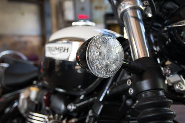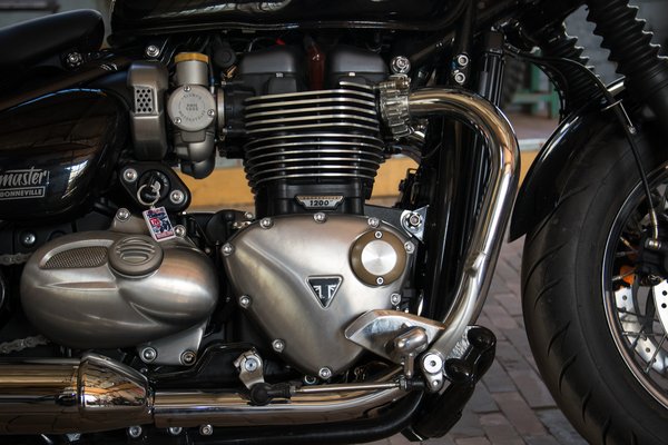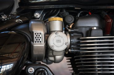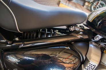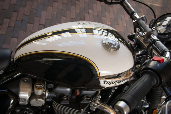 A tank tényleg gyönyörű, nemcsak a veterános öregek szeme párásodik be tőle, hanem bárkié, ha szereti a szépet. A fekete-fehér kombó az arany pinstripe-okkal (parasztosan: csíkokkal) mestermű – ráadásul nem holmi matrica, tisztességesen festve és lakkozva van. Mint a műkorcsolyában egy Salchow, álló forgásba átkötve, majd egy Rittberger, az aszimmetrikus tankbetöltő is kötelező elem, tökéletesen előadva. A fémfelületek is jó ütemben váltják egymást, a forgattyúsház selyemfényű, egy kis bronzos betét a kuplungfedélnél, fekete hengerek ezüst bordákkal – mertek játszani, és kiadja. Azt nem tudom, hogy ha már retró, akkor miért nem borostyánszínűek az indexburák, de ilyen előzmények után nem vitázom a Triumph dizájnereivel.