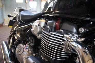 Hatvan éve az ős Speedmasternél a T120 még a végsebességet jelentette (120 mérföld per óra), ennél viszont a lökettérfogatot mutatja, 1200 köbcenti, hengerenként négy szelep, folyadékhűtés, 270 fokkal elékelt gyújtás – majdnem ugyanaz, mint a Bonneville T120-ban, de itt nem egy szimpla, hanem osztott iker-airboxot tettek a légszűrőhöz, ami az alacsony fordulati nyomatéknak kedvez. A hatszázas hengerek ellenére bársonyosan és simán jár, ami alapból erény, de nekem már a Bonnie-nál is sok volt ez a sterilség. 76 lóerő (6100-nál) és 106 Nm (4000-nél), vagyis 25%-kal erősebb és 40%-kal nyomatékosabb, mint a legutóbbi Speedmaster, de attól ez még nem erős, csak nagyon szépen megy.