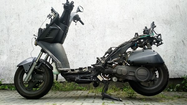 Tessék számolni: augusztustól december végéig jutott el idáig a projekt, mármint odáig, hogy a garázsban áll egy Kymco-csontváz és mellette egy zöldséges rekeszben a blokk. Ebben benne van Laci leterheltségétől a fontos alkatrész késedelmes érkezéséig minden. Az külön méreg, hogy novemberben még lazán járhattam volna robogóval, annyira jó idő volt. Ráadásul vettem egy Tucanót is rá Olaszországban, mivel ott elkezdték kiszórni féláron a készleteket. Épp volt ott egy Opel-bemutató, odarendeltem a szállodába. Időben meg is jött, kár, hogy nem azt küldték, amit rendeltem. Itt aztán az opelesek hatalmas segítségére is szükség volt, hogy hazakerüljön a Tucano, de meglett. Gyakorlatilag hiába.