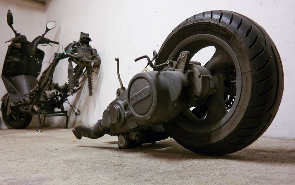 Mennyire hasznos, ha az ember autója vonóhorgos: már csak kölcsön kellett kérnem egy motorszállítót, amit most is köszönök Toci barátjának, Istvánnak. Nagyon baró így hazaszállítani a járművet, de hogyan tovább? A robogót nem vontatod el, nem akarsz még egyszer kölcsönkérni egy utánfutót, stb. Végül megegyeztem Kymco Lacival, hogy a hajtótömböt kiszerelve viszem el hozzá, hiszen a kiszerelés szinte ugyanannyi idő, mint a tényleges javítás.