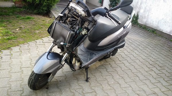 Akkoriban sok dolgom volt, hétvégente szakítottam egy-két órát az irgalmatlan mennyiségű burkolat lebontására, hűtőfolyadék-leengedésre, majd a csatlakozások kikötögetésére, és hasonlók. Szerencsére volt letölthető szerelési útmutató a neten, de elsőre így sem haladtam gyorsan, csavarok, alkatrészek elrakása, hogy tudjam, mit hová kell majd, stb. Ahogy elnéztem az FB-posztjaimat, augusztus harmadikán állt meg a Kymco, huszonhetedikére csupaszítottam le annyira, hogy hozzáfoghattam a motor kirámolásához, és szeptember hetedikén jött ki a blokk belőle. Ez cirka öt hét.