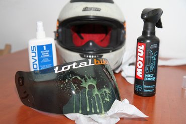 Ha sikerül rendesen betakarnom rovarral a sisakot, szoktam nyomni rá a Motul E7 nevű rovaroldóból - alapvetően bízom a Motul cuccokban, olajból is szívesen választom, de Gépátvétel Gábor szerint is nagyon jók a francia kenőanyagok, legalábbis a Motulban és az Elfben tökéletesen megbízik, én pedig az ő véleményében. Szóval a E7 gyorsan fellazítja a sisakra száradt dögöket, aminek a plexin van nagy jelentősége, csúnyán össze lehet karcolni az erőszakos vakarással.