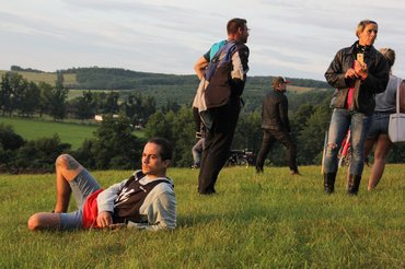 A domboldalban szikrázás után megint a Major, ez mindennek a közepe, itt lehet tunkolóst venni, meg 100 szikrás pólót vásárolni, meg inni. Közben a kis színpadon élőben megy az élő zene (Fat&Cute, Zanzinger), és itt volt a sátor alatt a babakék kávégép, amiből megint bitang tömény koffein-esszenciát kaptam, így nyertem újabb 2-3 órát, mielőtt a teljes kékhalál lefagyasztotta volna az agyam. Nem tudom, Pere Laciék hány ilyen kávét ihattak, vagy csak a helyi levegő pörgette fel őket, de hajnali háromnegyed öt után küldött egy „csótány a pirkadatban” fotót.
