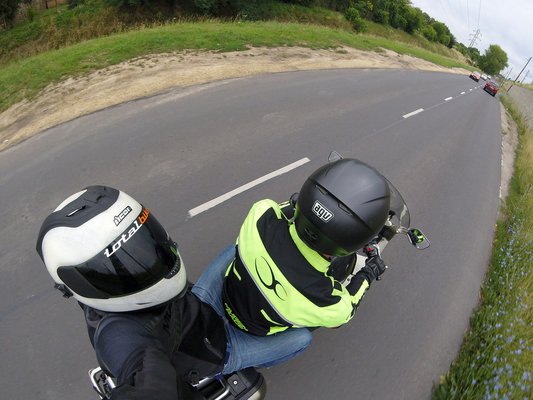 „Winkler cikke óta tudjuk, hogy motorozni nem sokkal veszélyesebb, mint autózni, csak a hülyék sokkal drámaibban tudnak meghalni benne, de sikerült egy olyan átfogó biztosítást kötnöm, ami védi a mögöttem ülőt is.” – válaszolta, amikor az esetleges balesetekről kérdeztem. Alap védőfelszereléseket, vagyis sisakot (átbeszélővel), kesztyűt, térdvédőt és dzsekit biztosít mindenki számára, sőt, zápor esetén esőruhát is.