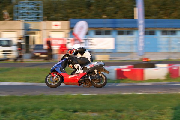 Igazán sokat mégsem ezektől várok, hanem A Giannelli Go kipufogótól. A régi Sito dobunkkal sem voltak súlyos gondok, miután kikapartunk belőle fél kiló kokszot. Nyilván így is maradt benne bőven, de nem a teljesítmény hiányzott, hanem a dőlésszög. Amikor lent voltam a pályán Antival és Zsoltival edzeni, feltűnt, hogy a jobbos kanyarokban nagyon hamar leért a kipufogókönyök. És nem csak nekünk, hanem a gyári dobbal szerelt összes minarellis SR-é és Aerox-é. Vagyis a pályán négy helyen is ott volt folyamatosan a leérő kipufogókönyökből származó esés veszélye, illetve hegeszteni is kellett, hogy ne lyukadjon át.