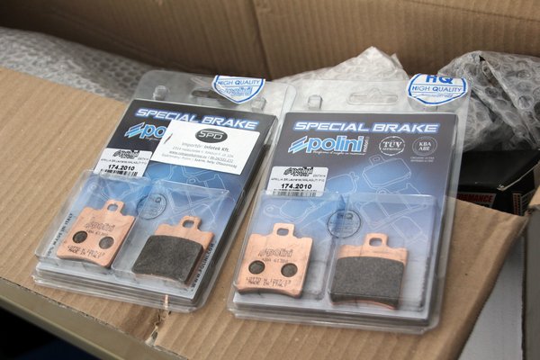 Kaptunk tőlük egy szett szinter versenyfékbetétet - Gépátvétel Gábor is megerősítette, hogy a Poliniben és a Malossiban meg lehet bízni. Nem is azért van ezekre szükség, mert nagyon hegyes féktávokat vennénk, hanem ha sokat korrigálunk fékkel (jellemzően hátsóval), ezekkel melegszik el a rendszer a legnehezebben - természetesen a minőségi (tehát francia) DOT5.1-es fékfolyadék alap.