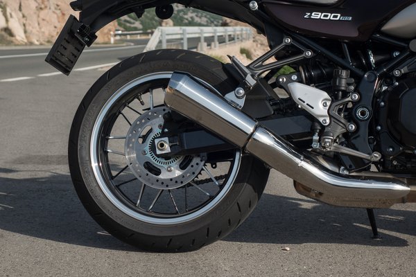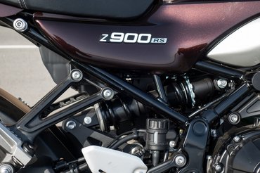A koncepciót azonban nem csak az optikára hegyezték ki. Mi sem mutatja ezt jobban, mint a normál Z900-nál jóval igényesebb első fék és futómű. A villa minden paraméterében állítható, a 300 milliméteres tárcsákat pedig radiális felső munkahenger segítségével radiális nyergek harapják. A jellegzetes, négylövetű kipufogót elvileg a súly miatt hagyták el, meg nyilván a gyártása is komplikált (=drága). Az acél csővázon főleg a dizájn miatt változtattak, hogy kiadja a klasszikus tank-ülés vonalat. A fék- és futóműtuningot általában nagyobb teljesítmény miatt szokás elkövetni, azonban az RS több mint 10 lóerővel gyengébb az alapváltozatnál. Mellesleg van ABS és kétfokozatú kipörgés-gátló is, melynek beállításait és egyéb adatokat megjelenítő LCD kijelzőt nagyon ízlésesen építették be az óracsoportba.