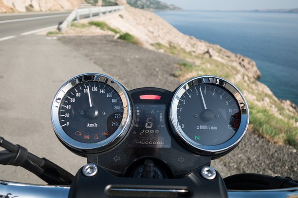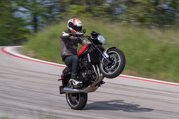 A lazasághoz nem csak tolóerő és finom kezelőszervek járulnak hozzá, hanem a kényelmes üléspozíció is. A normál csupaszoknál jóval egyenesebben lehet rajta ülni, a térd is kevésbé van behajlítva. A dupla hátsó rugóstagot csak addig siratja bárki, amíg nem fordult egyet az RS-sel. Az alacsony lábtartó ugyanis gyakran karcolta a horvát 8-as út aszfaltját. Bizony a szerkezet nem csak pózerkedésre való, tempót is lehet menni vele! Más stílusban, mint egy igazán sportos nakeddel. A magas kormány kevesebb visszajelzést ad az első kerék felől, és a kiülésnek sem kedvez. Gyakorlatilag erőkifejtés nélkül lehet bedönteni, a csillapítás kellően feszes. Bár a radiális fék sportmotorosan erős és adagolható, a kemény tempó nem állna jól ennek a motornak. Eggyel alatta viszont baromi élvezetesen lehet szörfölni vele.