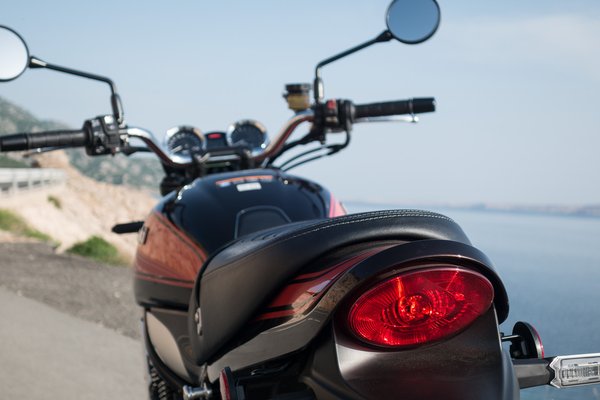Ettől függetlenül a forma nagyon adja, megvan minden klasszikus formaelem: kerek lámpa, csepptank, hurkás egybeülés, felhúzott hátsó sárvédő. A krómot hál'Istennek nem vitték túlzásba. Ehhez jönnek az igényes részletek, mint az óracsoport, a hengerfal bordázása, a vékonyküllős, részben polírozott felnik. A kerek led fényszórót a nappalimban is szívesen nézegetném – eszméletlen jól néz ki a modern fénytechnika a klasszikus, kerek krómházban. A koronát pedig a fényezés teszi fel az egészre – a Z1-et idéző feláras metálbarna-narancs kombináció élmény a szemnek.