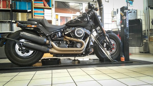 Azt valahogy mindenki ellenezte, hogy magam heréljem a gyári dobot, a Harley pedig csak Vance&Hines-t forgalmaz, amely viszont még nem készült el a 2018-as Fat Bobra való dobokkal, és majd szólnak, ha lesz, de még a számítógépes rendszerben se látszik. Az van, hogy nem szeretem az ordító motort, az XJR-ben sem kedveltem, hogy a Bódis-dob olyan 40 ezer kilométer után meghangosodott. De a néma motor, higgyétek el, kínszenvedés. Nem halk: néma. Érzem, mit akarna mondani, de nem jön ki hang a torkán. Végül eszembe jutott Gigamachine Csabi, ki is gurultam hozzá Solymárra. Nála már többféle kipufogó is rendelhető az új Fat Bobra, bár eleinte azt hittem, rávehető majd egy szakszerű belezésre, de kategorikusan elzárkózott.