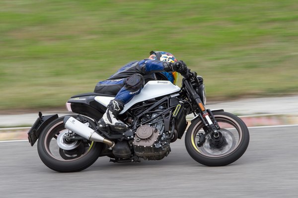 Az alacsony kormány itt nem csak jól néz ki, hanem az irányíthatóságnak is kedvez, ha rendesen terhelve van az eleje. Kakucson bőven elég ekkora motor, sima utcai sportgumikon is nagyot lehet menni vele. Nem ér le mindene, a futóműve is meglepően összeszedetten működik, pedig nagyon nem erre lett kitalálva. Aztán ha nagyon forszírozná az ember, elbírna egy jobb minőségű futóművet, le is lehetne egy picit áttételezni. Akár össze lehetne vásárolgatni hozzá mondjuk a kupás KTM RC390 alkatrészeit (rugóstag, lábtartó, stb.), és építeni egy ultimate cafe racert. Elvégre van a Husqvarnának Grand Prix múltja is.