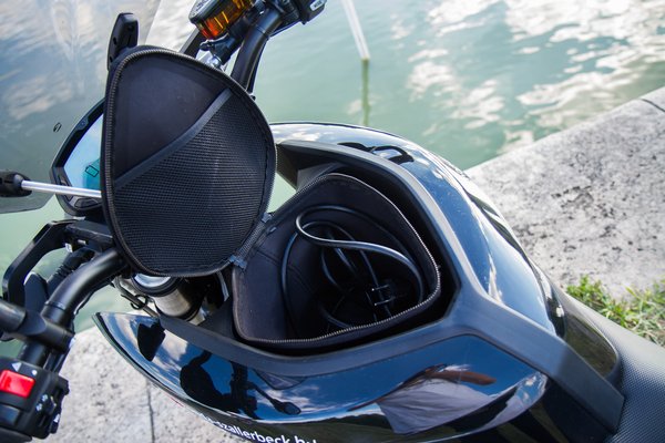 Az üléspozíció is már olyan, hogy egyből megemelkedik tőle pulzusom: a motor rendkívül karcsú, a térdszög ha nem is sportmotoros, de nem is papás, a kormány széles, alapból egyenes háttal ülök rajta, igazi streetfighteres pozícióban. És mivel minden súlyos dolog középen és mélyen van, már egészen kis tempónál is gondolati úton irányítható – a tank helyén egy cipzáras tároló van, ahová a töltőkábel mellé még a napi apróságokat is beszórhatjuk. Érdekesség: a kábel ugyanolyan tápkábel, mint ami a számítógépemhez is van, csak egy kicsit vastagabb. Nagyjából nyolc óra nulláról a teljes töltés, az újabb modelleket viszont már gyorstöltőről két óra alatt fel lehet rántani 95%-ra.