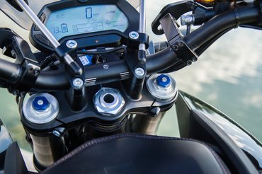 Az első kerék az utcai motoroknál megszokott 17-es helyett 19 collos, vagyis nagyjából ugyanaz a leosztás, mint a V-Stromtól a BMW R 1200 GS-ig a legtöbb, főleg aszfaltra tervezett túraendurónál, és rugóútból is jól áll: elöl 178, hátul 179 mm áll rendelkezésre. Mégsem hintázik vagy bólint hatalmasat, mint a japán szoftendurók, hanem a csillapítás könyörtelenül elnyelt mindent. És a fékek! A spanyol J.Juantól jönnek, ugyanúgy, mint a KTM 790 Duke-nál, és az egyetlen (igaz, 320 mm átmérőjű) tárcsával is könyörtelenül megfogja a motort, miközben olyan bámulatosan és érzékein adagolható, hogy mintha sportmotoron ülnék.