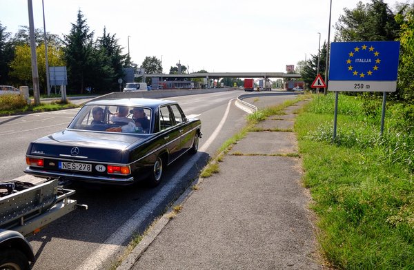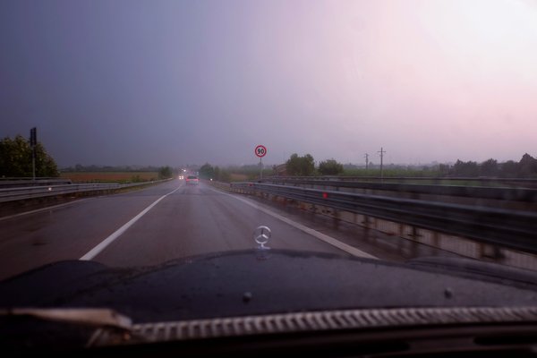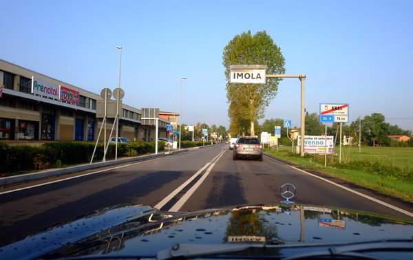 Olaszország határát Endrével a volán mögött lépte át Nessy. Mivel mindig felizgat, ha valamelyik veterán autóm újabb országba jut el, ezért nem mulasztottam el a határfotót sem, ezek kötelező emlékek. Egy kávéra még megálltunk valahol Velencén túl, majd Bolognának vettük az irányt, ahol aggasztóan Vénuszbeli felhők borították az eget. Az Accuweather pokoli időt jósolt estére, a Waze óriási tereléseket írt, végül egészen apró utakon, barna ég alatt, villám-fegyverropogásban vettük be az utolsó nyolcvan kilométert. Mintha a pokolban lettünk volna, de azért közben még melegebben a szívembe zártam az EU-s ingyenes mobilroaming-rendelkezést, ami miatt folyamatosan, online láttuk, mi jön, és hogyan lehet elkerülni. Két évvel ezelőtt még belefejeltünk volna a bolognai őrületbe és éjfélre értünk volna csak a szállásra.