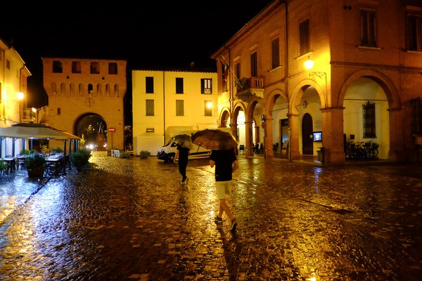 Így viszont fél kilenc tájban, már a Bagnara di Romeán levő airbnb-nket elhagyva, kajáldát kerestünk. Azt hittem, valami unalmas alvófaluban sikerült szobát foglalnom, de kiderült, Fellini-filmbe illő, sárgás lámpákkal, reneszánsz városházával, macskaköves főtérrel díszített, városfallal kerített, hangulatos kisvárosba toppantunk. A pizzéria a főtéren volt, mellette éjjelig nyitva tartó fagyizó, ahogy kell, épp csak Vegyevigye hiányzott, ahogy vörös ruhájában ellejt a mutáló hangú kamaszfiúk előtt.