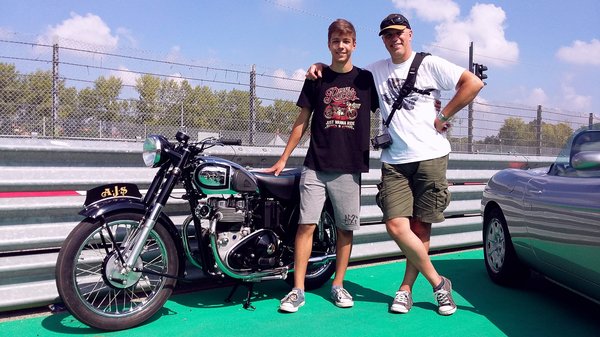 Pokoli erővel aztán sikerült kitámolyognunk a boxokon át a kinti részre, ahol az autók állnak. Endréék jó társaság, türelmesek, ha mozdulni kell, mozdulnak, amikor a többiek elindulnak, néha ezt-azt kérdeznek, kicsit fotóznak, de hiszen Endi már a gimiben is ilyen csupaszív srác volt, sose bántott senkit. Mi nyilván kellemetlenebbek lehettünk, mert mindkettőnk zsebét égette a pénz. Láttam Bálint arcán az átváltozást, ahogy elkezdte felismerni a motorokat, amiket az Oldtimer Markt Preise Sonderheft 2017-kiadványomból az elmúlt hetekben magába szívott.