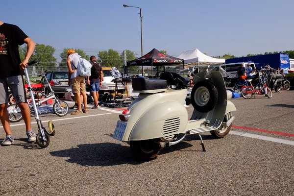 Összeakadtunk a Csabival, aki hozta lefelé a gyönyörűséges faro bassa Vespát. 1960-as motor, san marinói, tulajtól, minden papírjával, nagyjából készre restaurált, csak apró részletek hiányoznak még – rozsdásak a kerékcsavarok, lyukas a kipufogókönyök. Különben a lemezmunka tökéletes, a fény, az ülés hibátlan, mechanikailag teljesen pöpec. Letessékeltem a gépről, szúrtam egy egyest, hű de finom. kettő, a váltó is sokkal jobb, mint a későbbieken, három, de nyomatékos ez a motor!, aztán sípolás, ennyit tudtam meg az utolsó alsó fényszórós 125-ösről. Azaz a féket is kipróbáltam. Itt ütköztem bele Imola egyik nagy, mostanában körvonalazódó problémájába – valahogy kevés a látogató. Eddig, ha nem is háborítatlanul, de azért pianóban mindig lehetett pöfögni a motorokkal, mert a sok ember között elveszett a kevés pályaőr. Most viszont ugyanannyi van belőlük, s messzire ellátnak, meg is állítanak mindenkit, aki motorozni mer. Mi történt itt?