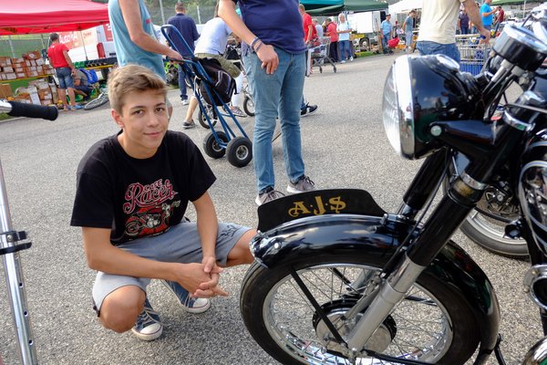 Majdnem odaadta az olasz, szerencsére 4000 környékén elakadtunk, akkor kellett már egy pszichológiai szünet, Dani javasolta, menjünk át, nézzük meg a nagy halat, az AJS-t. Kicsit örültem is neki, mert ennél a BSA-nál drágább, jobb állapotú, legfőképpen meg erősebb motort szerettem volna hazavinni, ami bírja kettesben mondjuk, Dobogókőt, vagy a Mátrát. Tudom, az oldalt szelepelt motoroknak hatalmas a nyomatékuk, az a 13 lóerő emiatt nem ugyanaz, mint egy mai motor 13-a, de akkor is kevés. Ezek ilyen 65-öt utaznak két személlyel, csak hogy képbe helyezzek mindenkit.