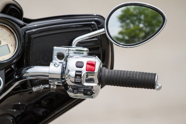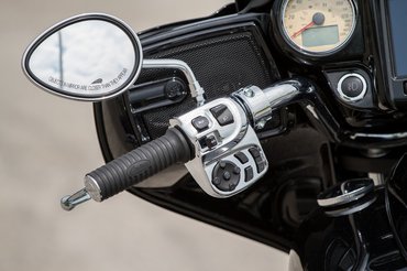 A fejidomon sem gondolkodtak sokat, három lámpa, sok króm, de hiába, nincs tagolva, mintha itt is az lett volna az elsődleges feladat, hogy úgy legyen Batwing, hogy nem néz ki Street Glide-nak. Krómból egyébként jutott mindenhova bőven, például telibenyomták a markolat melletti kapcsolóházat is, ami akkora, hogy szegényebb helyen kiakasztják madáretetőnek – sok rajta a gomb, de ez a méret akkor sem indokolt, a tempomat kapcsolója például olyan messzire került, hogy a benyomásához el kell engednem a kormányt.