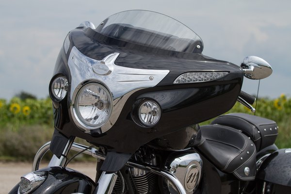 Amennyire jól néz ki a blokk, annyira jellegtelen lett a többi része, mintha a dizájner gyorsan le akarta volna tudni. Első sorban a mérete, ami üt a hatalmas fekete felületekkel – ezekre azért emlékszem ennyire tisztán mert mosás után áttörölgettem egy ronggyal – aztán jönnek a kötelező elemek, a negyvenes évek Indian Chiefjeire utaló uszályos sárvédők, amiből például az első akkora, hogy teljesen el is takarja a négydugattyús féknyergeket. Aztán ott van rajta egy üveg indiánfej amolyan Dragon Ball frizurára hajazó fejdísszel, gondolkodtam is rajta, hogy vajon ki szerint néz ki jól? Minden bizonnyal ugyanaz hagyta jóvá, aki a szegecsekkel kivert ülést, és még örüljek, hogy a széria kormányhínárt megúsztuk.