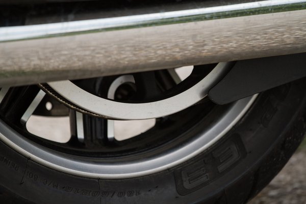 És mindenhol logó és branding: a tank két oldalán, a két tankbetöltő között (amiből csak az egyik igazi, a másik dísz), a tankon futó bőrdíszen, a fékfolyadék tartályain, a műszerfalon, a tárolórekesz fedelén, a TFT kijelzőn, az oldaldobozok zsanérjain, a lábtartó trepnin, a fékpedálon, a blokk mindkét oldalán, az ülés mindkét oldalán, az olajbetöltő fedelén, a markolatokon, a kormányvégeken, a tükrön, mindenhol. Mintha krónikusan rettegnének attól, hogy valaki Harley-nak nézi. Vagy ami még rosszabb: Yamahának.