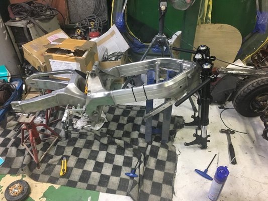 Amúgy a gyári száraz tömeg katalógus szerint 134 kiló erre a változatra. Ami azért nem rossz, meglátjuk mennyivel tudom alulmúlni. A segédváz helyét betöltendő lett egy szép kézműves alu, amin gyakorlatilag semmi nincs az akkutartón (igen sajnos kell bele akku, hogy miért azt majd később) és a motorvezérlő tartó fülein kívül. Nagyszerű. Megvolt majdnem minden, ami ahhoz kell, hogy elkezdjem összerakni a vázat. Már csak arról kellett dönteni, mi legyen a futóművel. Itt nem ragaszkodtam a korhű restauráláshoz. Elmondom miért.
