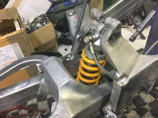 A futómű, ami kijött a gépből, az kuka. Ennyi. Olaj már rég nem volt a környékén sem, nemhogy benne. Szimeringek ennek megfelelő állapotban. Tehát teljes totális újjáépítést kérne. Itt jöt a képbe pár srác Thaiföldről és az ő nagyszerű hozzáértésük és termékeik. Legyen elég annyi róluk, hogy brit származású, Ázsiában ragadt arcok, akik versenyeztek anno ilyen 250-es gépekkel, illetve az egyikük a mai napig tesztel az Öhlins ázsiai fejlesztési osztályának. A mostani pályajártasságom nem indokolja, de szerettem volna bele egy olyan futóművet, amit majd az évek alatt szépen személyre lehet szabni. Így lett az, hogy a thaiföldi cég és az Öhlins közös szerelemgyereke, egy minden ízében állítható, külső tartályos hátsó gátló pattant be, ami kifejezetten az NSR-hez lett fejlesztve kb. 10-15 évvel az NSR gyártásának befejezése után. Azzal az előnnyel amit, anno csak TT-F3 gátló tudott, hogy állítható a motor magassága is. Közben még valahogy a talált tárgyak osztályáról beesett egy hidraulikus előfeszítés állító is, amit végül nem tettem fel a gátlóra, mert eléggé le van harcolva szegény, de talán egyszer lesz kapacitásom rendbe rakni.